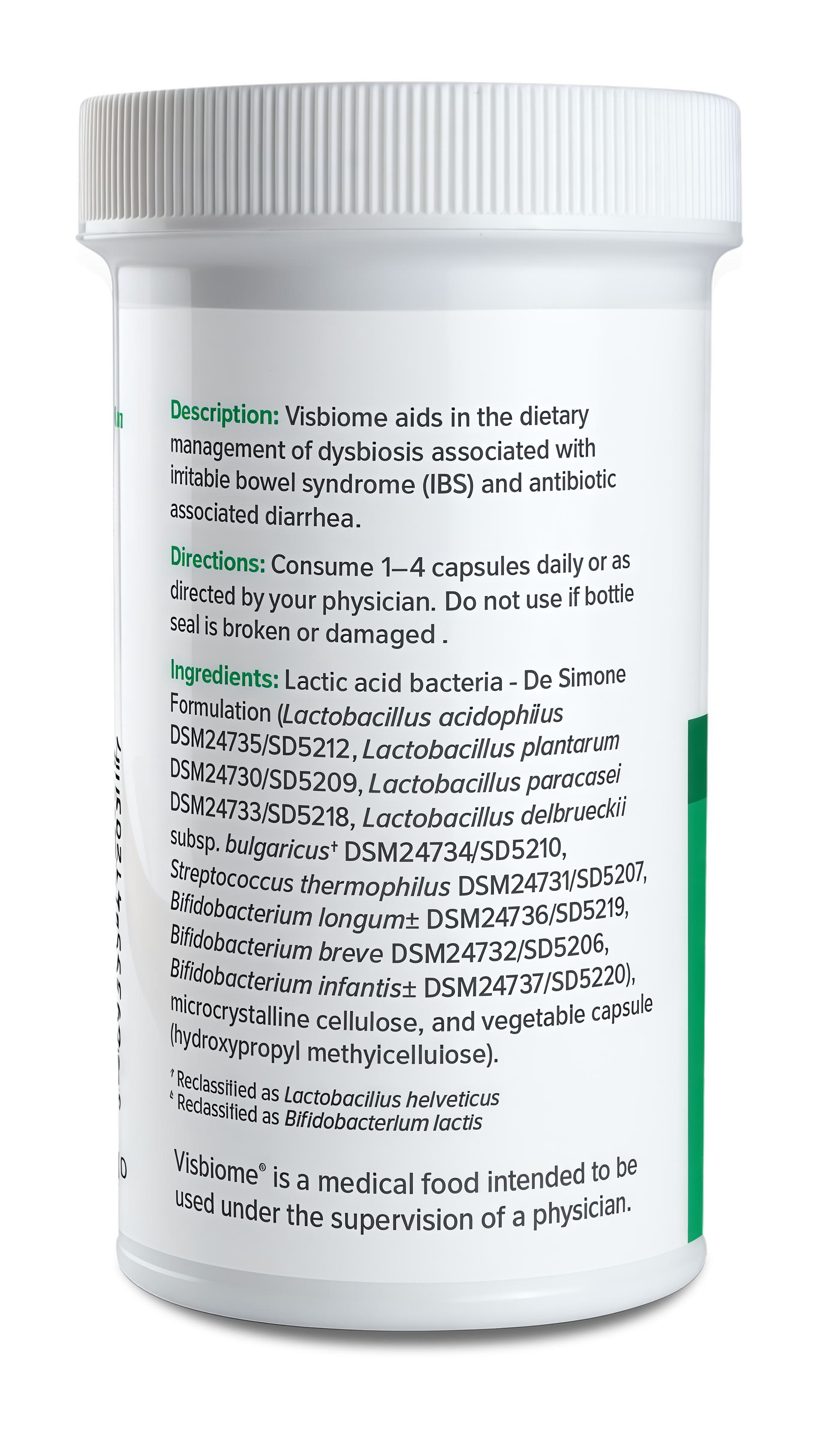 Visbiome is a medical food specifically created to be consumed under doctor supervision and aids in the dietary management of digestive issues. It is the most studied multi-strain probiotic on the market.